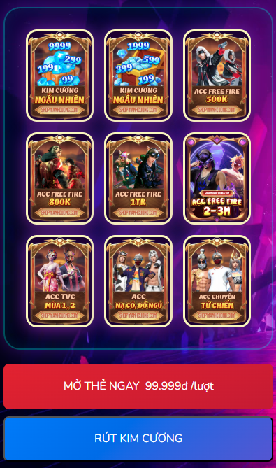 Chỉ từ 99.000đ/lượt, bạn đã có cơ hội nhận được tài khoản Free Fire giá trị cao, từ vài trăm nghìn đến vài triệu đồng, thậm chí là acc VIP với nhiều đồ hiếm, skin súng và vật phẩm giá trị.
